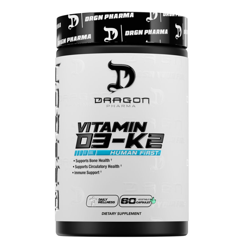 Dragon Pharma D3/K2 proporciona 50 mcg de vitamina D3 y 200 mcg de vitamina K2. Estas dos vitaminas cruciales y liposolubles son vitales para la salud, ya que la D3 ayuda en la absorción de calcio, lo que lo hace esencial para huesos fuertes.
