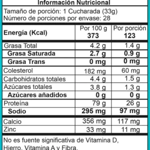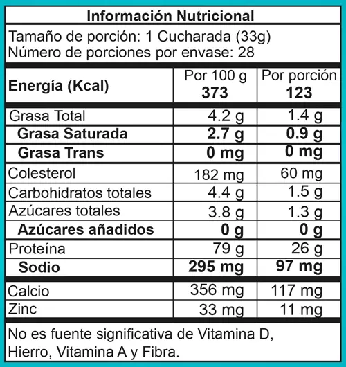 Ingredientes: Proteína Concentrada de Suero de Leche, Proteína Aislada de Suero de Leche, Saborizante Idéntico al Natural, Dióxido de Silicio (Anticompactante), Goma Xanthan (Espesante), Carboximetilcelulosa (Estabilizante), Lecitina de Soya (Estabilizante), Citrato de Sodio (Estabilizante), Lactasa en Polvo, Citrato de Zinc, Stevia (Edulcorante), Piridoxina (Vitamina B6).